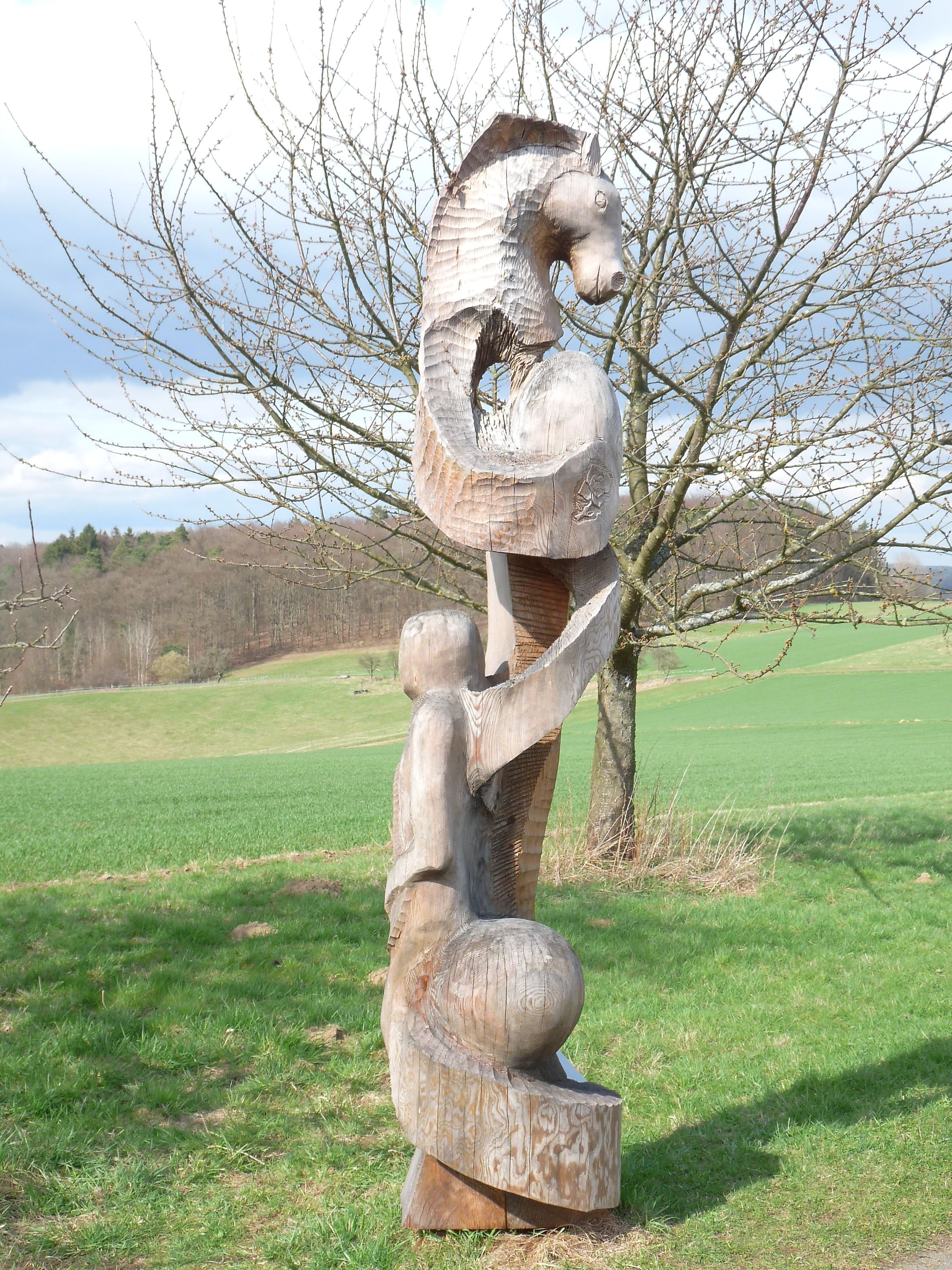 Der Wanderweg, der durch und über die Höhen des Gelbachtals und die Montabaurer-Stadtteile Wirzenborn, Reckenthal und Bladernheim führt, ist seit eh und je eine beliebte Flaniermeile mit Blick auf Schloss Montabaur in der Region südlicher Westerwald. Hier kannst du Wandern mit Kunstgenuss verbinden, denn nach insgesamt vier Holzbildhauer-Symposien auf dem Fischerhof in den Jahren 2009, 2010, 2011 und 2014 säumen jetzt 42 unterschiedliche Holz-Skulpturen die beiden Rundwanderwege.