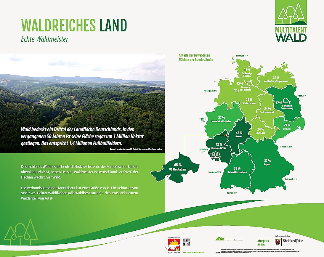 You begin this educational hike at the forest parking lot of Großholbach. An information board gives you an overview of the route. Passing the football field with a nicely located barbecue hut, a gravel path takes you into the forest. Some areas had to be cleared due to severe bark beetle infestation. Information boards explain the current significance of the forest, and some tall beeches and oaks line the path. At an intersection, you come across the hiking trail "Wäller Route Eisenbachtal." There, you continue straight ahead. Shortly after the information board about the forest as a wood supplier, the path splits, and you turn left. The path leads you slightly downhill over the next intersection. You reach a forest road, which you take to the left. Below the path, a cozy bench invites you to rest, and as the information board tells you: there you can really take a deep breath! After a relaxing pause, you continue straight ahead. At the explanations about the Wald waterworks, turn left. Shortly thereafter, you reach the display of the Nassau Nature Park. Again, turn left until you reach the sign: Sign Forestry, Sustainability in the World. You take the gravel road to the right and reach the intersection that you already know from your outbound route. To the right, it goes back to your starting point.