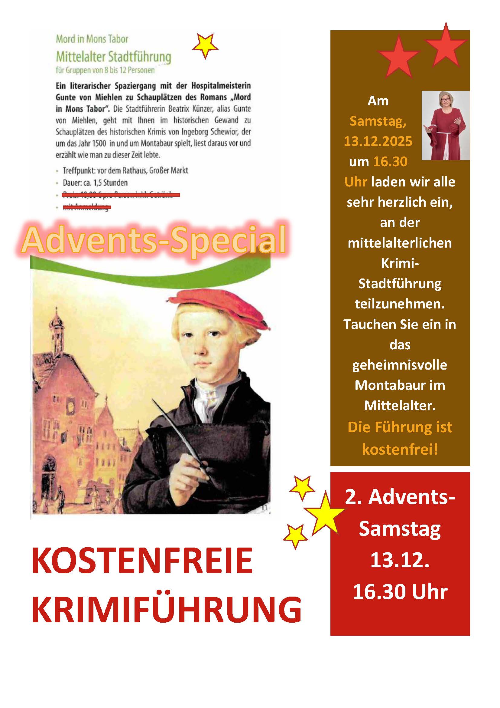 Am Samstag, 13.12.2025 um 16:30 Uhr laden wir alle sehr herzlich ein, an der mittelalterlichen Krimi-Stadtführung teilzunehmen. Tauchen Sie ein in das geheimnisvolle Montabaur im Mittelalter. Die Führung ist kostenfrei!